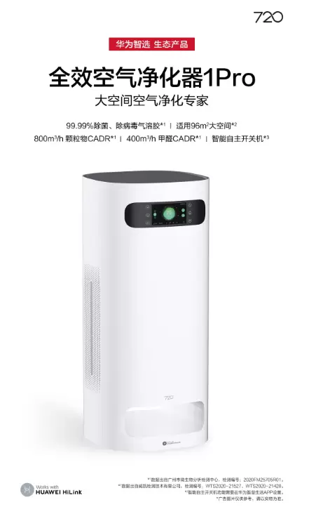 2020年,华为智选 720全效空气净化器1Pro作为空气净化器行业的优秀代表入选国家“企业标准领跑者”名单,以自身树立行业标准,用品质走在行业前列。