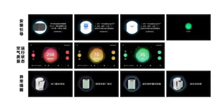 搭载5寸IPS高清彩屏,灵动简约的UI界面,信息显示一目了然。实时显示PM2.5数值、室内温/湿度、风速档位状态、运行模式、滤芯损耗以及智能动效辅助, 用户进行配网、滤芯更换时有全程动效操作指引。