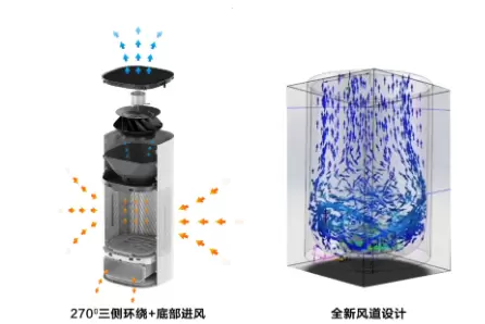 全效空气净化器1Pro采用270°三侧+底部进的立体进风系统,进风量加大,室内空气循环加速。全新的风道设计,让机器迸射澎湃风量,最大适用面积96㎡空间空气完整过滤一次只需不到17分钟![4]