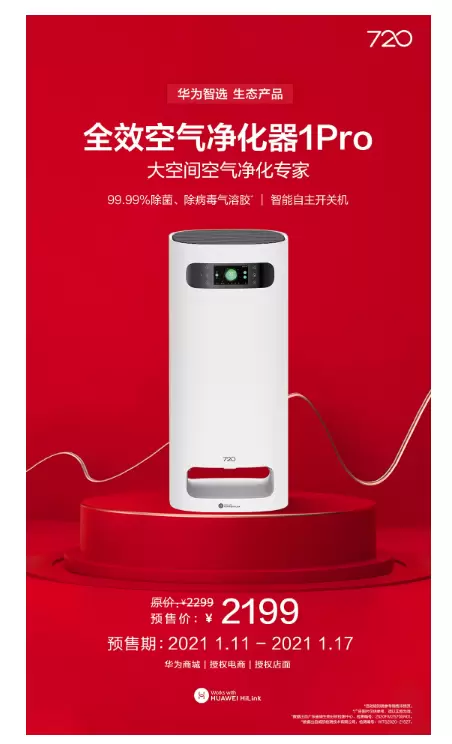新年伊始,华为智选与柒贰零(北京)健康科技有限公司联合定制一款属于您的空气净化专家——全效空气净化器1Pro,对比同系列产品,此款进行了多处升级,比如全新的风道设计、净化效率、芯片运算等等,从而提升机器的净化效率,轻松应对复杂大空间空气净化的需求。消毒、灭菌、净霾、除醛、清新,一样都不少,净化更强悍、更聪明。