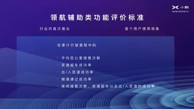 不仅如此,小鹏汽车还在本次活动中推出了首个领航辅助类功能评价标准,包括驾驶员接管次数、变道超车成功率、匝道通行成功率、隧道通过成功率及夜间同类型数据等。该评价标准完全基于用户使用角度,也是首个用户视角的领航辅助类功能评价标准。小鹏汽车自信地表示:我们欢迎用户以此类标准去评价NGP的表现,同时也欢迎所有媒体鹏友的测试以及友商的PK。虽然这个标准是首次推出,肯定还有不完善的地方,未来我们也会不断迭代,但我们希望通过这种尝试与探索,推动此类型功能的研发与落地更加关注用户使用体验,也希望让更多用户了解该如何正确的看待、使用以及评价此类功能。