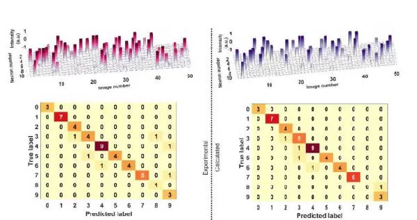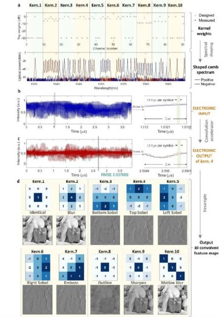 通过这一系列步骤,数学模型抽象的神经元突触就被光频梳在实际物理系统中实现,其中突触连接的权重由光频梳的光功率体现。最终实验验证了高维图片处理(实验结果如图2所示)以及深度学习光子卷积神经网络(实验结果如图3所示)。