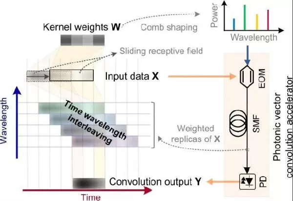 研究人员将该光频梳进行频域整形并且与高速光电调制相结合,实现了输入数据在并行波长通道上的组播与加权,然后采用光学色散介质作为缓存,对组播信号进行了步进延时(步长为单个码元时长),从而在时域上对齐了不同波长通道中需要加权求和的码元,最后通过光电转换实现处理结果的高速实时读取(如图1所示)。通过这一系列步骤,波长构架的卷积窗口(感知域)即可在时域以超过60GBaud的速率滑动,结合克尔光频梳所实现的高并行度(C波段90个波长通道),实现了11 TOPS(太运算每秒)的运算速度,即每秒可完成11万亿次运算。