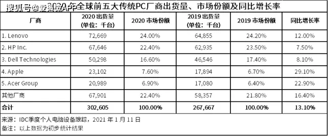 从2020年全年来看,联想仍以24%的市场份额排名第一,同比增长率12%,苹果是所有厂商中增长最快的,同比增长率高达29.1%,2020年市场份额达到7.6%,仅次于联想、惠普、戴尔,位列全球第四。
