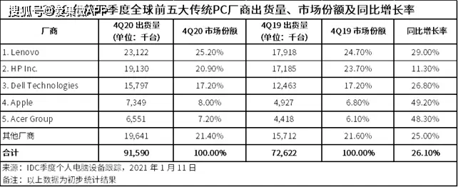 IDC数据显示,2020年第四季度,联想份额上升到25.2%,而惠普下降到20.9%,前三大厂商中联想增长最为迅猛。同比增长率高达29%,稳居第一。