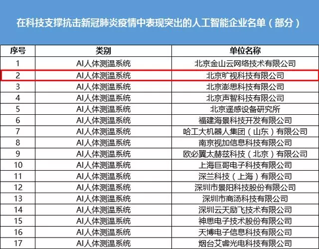 图:旷视入选工信部"在科技支撑抗击新冠肺炎疫情中表现突出的人工智能企业名单"(以拼音首字母排序)