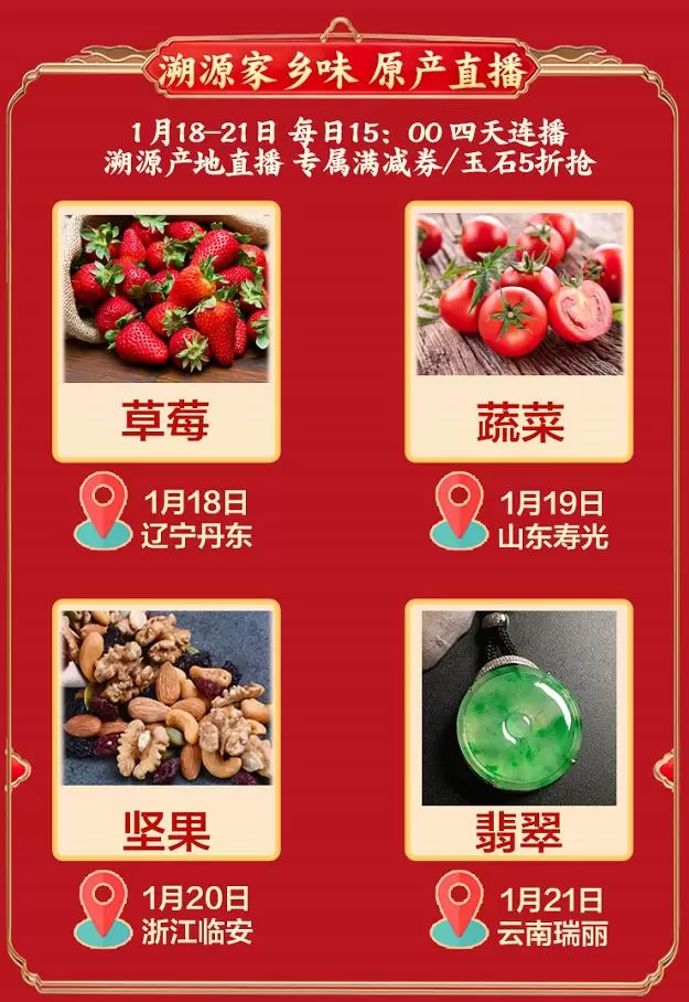 在苏宁年货节中,为抚慰众多粉丝异地过年的乡愁,苏宁更是为粉丝们溯源家乡味,开启乡味原厂地直播的先河。1月18日辽宁丹东的草莓、1月19日山东寿光的蔬菜以及1月20日浙江临安的坚果,都在苏宁年货直播的表单中。让众多苏宁粉丝,身在异乡过年,也能尝到家乡的味道。