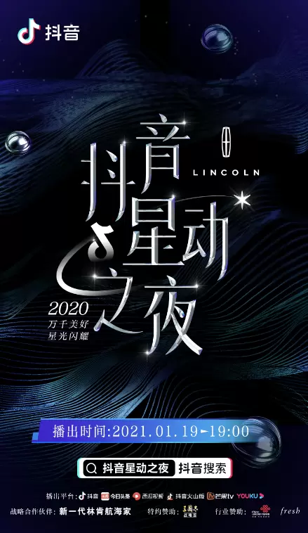 抖音星动之夜战略合作伙伴为新一代林肯航海家,由真实战场-三国志·战略版特约赞助播出,由中国联通、Fresh馥蕾诗行业赞助播出。届时,明星爱豆也将在抖音星动之夜上带来神级舞台、玩转现场。除了有劲歌热舞的视听享受外,还有众多创新形式的趣味舞台和意想不到的惊喜合作将在盛典一一上演,实力诠释“万千美好,星光闪耀”。