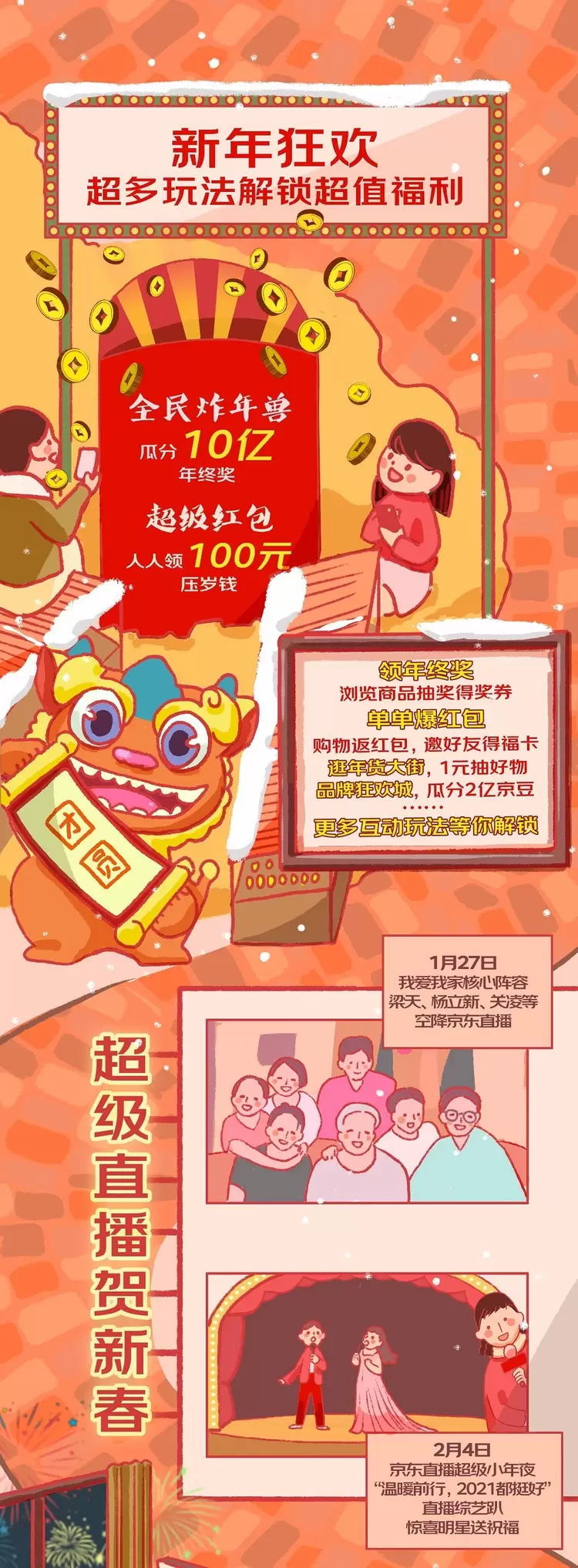 京东年货节还准备了多样互动玩法。1月22日-2月4日,京东“百元补贴”推出1元购10个口罩或500克瓜子福利,下单即返100京豆;以“全民炸年兽”和“超级红包”为代表的多种互动游戏持续在线,逛年货就能瓜分现金红包或京豆;1 月27 日,经典情景喜剧《我爱我家》主要阵容梁天、杨立新、关凌等走进京东直播间,与消费者重温“家”的内涵和年的回忆;2月4日,京东直播还将奉上 “温暖前行,2021都挺好” 超级小年夜直播综艺趴,邀请近10位艺人边唱边聊提前开启“春晚”。