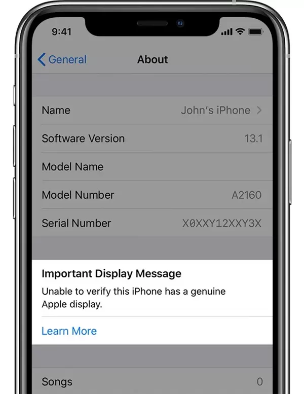 与非正品iPhone换用显示屏后的类似警告一样,这条消息很可能会根据需要出现在 "通用">"关于 "下的 "设置"应用中,该警告也可能会在短时间内作为通知出现在锁屏上。