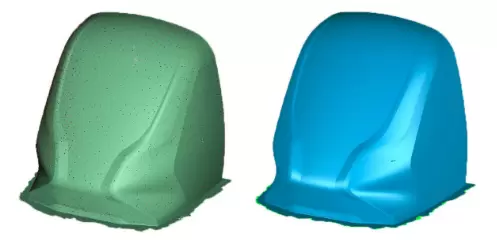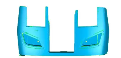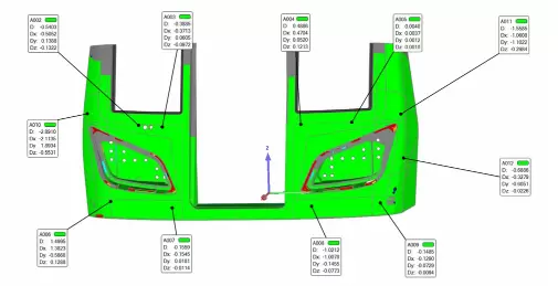 思看科技同样选择了手持三维扫描仪搭配MSCAN全局摄影测量系统的解决方案。先使用全局摄影测量系统MSCAN,获取车头的空间定位点,再搭配手持式激光三维扫描仪进行三维数据的获取,最后将扫描得到的三维数据与车头的数模进行比对,计算出形变量,用于后期产品改进。