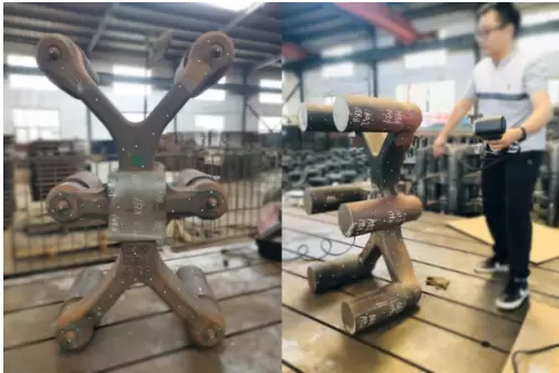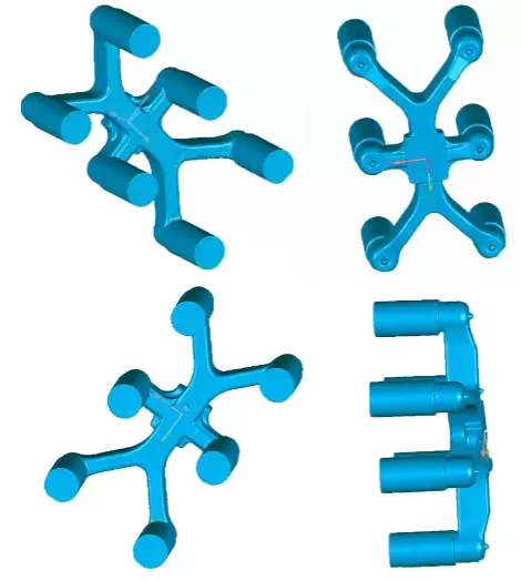 检测的这个火车底盘结构铸件长约1200mm,宽约600mm,高约400mm,6个圆锥体支撑起上面的中间平台,铸件体积属于中大型,多曲面、多夹角。需要测量出6个圆锥不同截面的直径大小,各夹角度数,中间平台的长、宽等,为后续精加工确定数据。