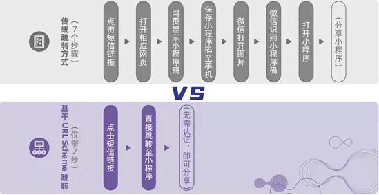 而URL Scheme接口,通过开放的多消息渠道链接跳转,直达小程序,则为两者的优劣互补提供了可能性,带来了1+1>2的效益。
