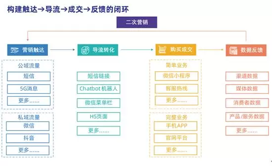 构建触达→导流→成交→反馈的闭环。URL Scheme接口仅仅解决了从短信到小程序之间的导流转化。而ICC融合通信中台则可把“触达→导流→成交→反馈”整个闭环构建地更为完善。特别是5G消息,可通过Chatbot机器人及菜单栏,实现更智能、更全面的导流转化,唤起手机APP、官网页面、客服热线等更多的业务系统平台。