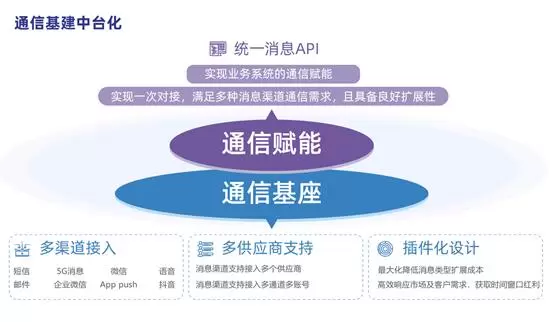 而ICC融合通信中台,则可通过通信基建中台化,将URL Scheme接口的价值,实现最大化——向下以“通信基座”对接,实现多渠道接入、多供应商支持、插件化设计,可预置集成N+通信渠道平台,从根源上实现彼此之间的互联互通;向上则通过“统一消息API”实现业务系统的通信赋能,一次对接,满足多种消息渠道通信需求。