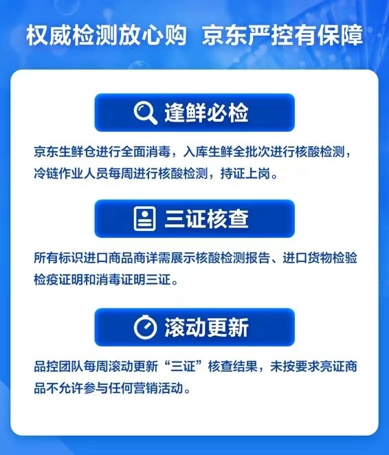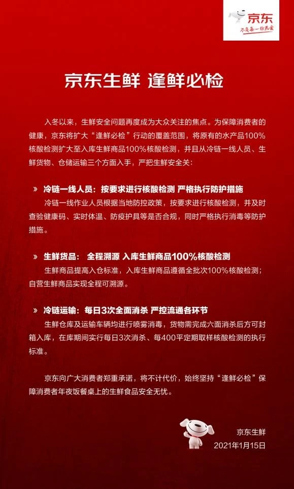 为了让消费者安心,京东生鲜也继续坚持“逢鲜必检”政策,冷链作业全面消杀,作业人员周度核酸检测,持证上岗,做到入库生鲜全批次核酸检测,并严格遵守政府有关冷链入仓的各项政策,全力保障消费者的菜篮子安全。京东物流的“春节也送货”服务将进一步扩大范围,即使在除夕至大年初三,消费者也可在全国30个省份、近300个城市、1500个区县正常下单收货。此外,京东还积极发挥自身技术优势,通过直接获取的消费端大数据,提前洞察市场需求动态,并联合供应方,高效响应市场,确保市场供应充足。