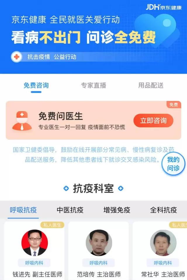 发布会上,京东集团副总裁曾晨介绍,从现在开始到春节期间,京东健康确保口罩、额温枪、洗手液、酒精湿巾等防疫物资足量供应,线上开通抗疫免费在线问诊服务,方便居民随时问诊。