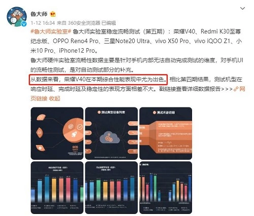 再者,鲁大师公布的《体验评测报告》则透露荣耀V40拥有行业顶级的体验。报告显示荣耀V40在稳定流畅测试和动效测试中取得安卓阵营的双料冠军,流畅性表现大幅领先其它旗舰手机,鲁大师官方甚至基于出“尤为出色”的高度评价。
