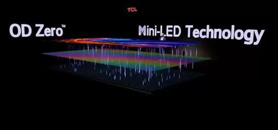 首先来看TCL,在今年的CES2021上,TCL发布了第三代Mini LED显示技术——ODZero,ODZero技术相比于去年CES推出的VidriaMini LED技术来说更加轻薄,原因在于TCL将Mini LED背光层与LCD面板之间的距离做到了0mm,实现了完全贴合,这有利于大幅度降低液晶面板整体的厚度。