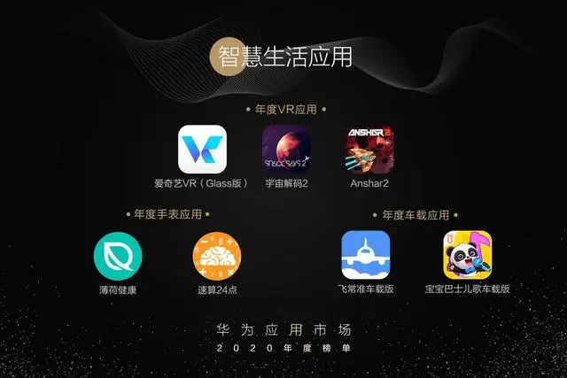 《云记》、《FlipaClip》、《Noteshelf》使人们在平板上自由挥洒灵感、高效生活;《悟空识字》、《乐播投屏》、《全民五子棋》将手机应用延伸到了更大的屏幕体验;《爱奇艺VR(Glass版)》、《宇宙解码2》、《Anshar2》赋予用户身临其境的震撼感知;《薄荷健康》、《速算24点》时刻记录你的变化,填补闲暇时光;《飞常准车载版》、《宝宝巴士儿歌车载版》让人们在出行时也能无缝连接应用的精彩。