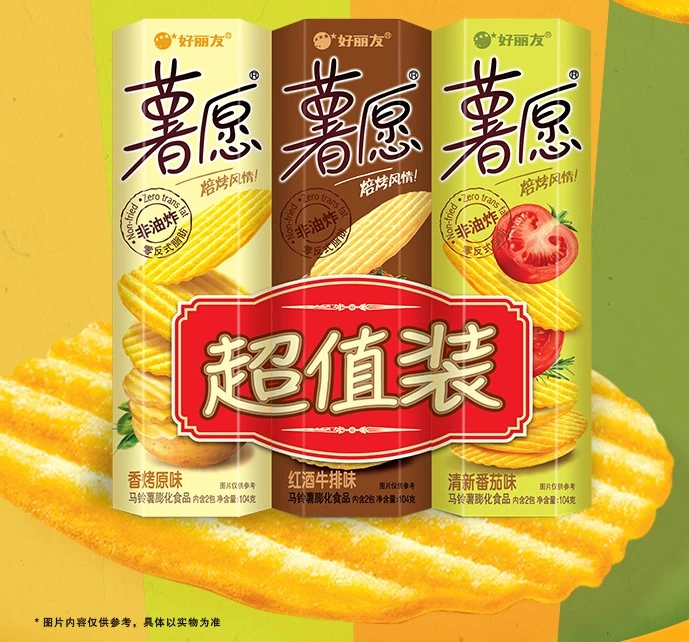 还要来一个跨年龄段全民都无法抗拒的好丽友薯愿,非油炸的制作工艺也真正是老少咸宜,妈妈再也不用担心我吃得不健康了。一组三种口味,番茄味清新、红酒牛排味香醇浓郁、香烤原味能吃得到的薯片香。说是居家旅行必备一点也不为过,波浪状的大片薯片,一口咬下去脆脆的,光听声音都够馋人!没有人会不爱吧!