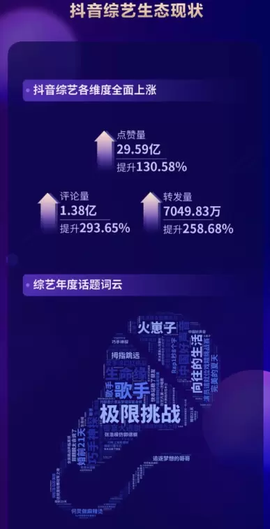 《2020抖音娱乐白皮书》数据显示:抖音综艺市场发挥潜力巨大,抖音综艺各维度全面上涨。综艺点赞内容超29.59亿,评论量超1.38亿。可见抖音综艺内容不断扩张,生态蓬勃发展,获得更多流量注入平台。