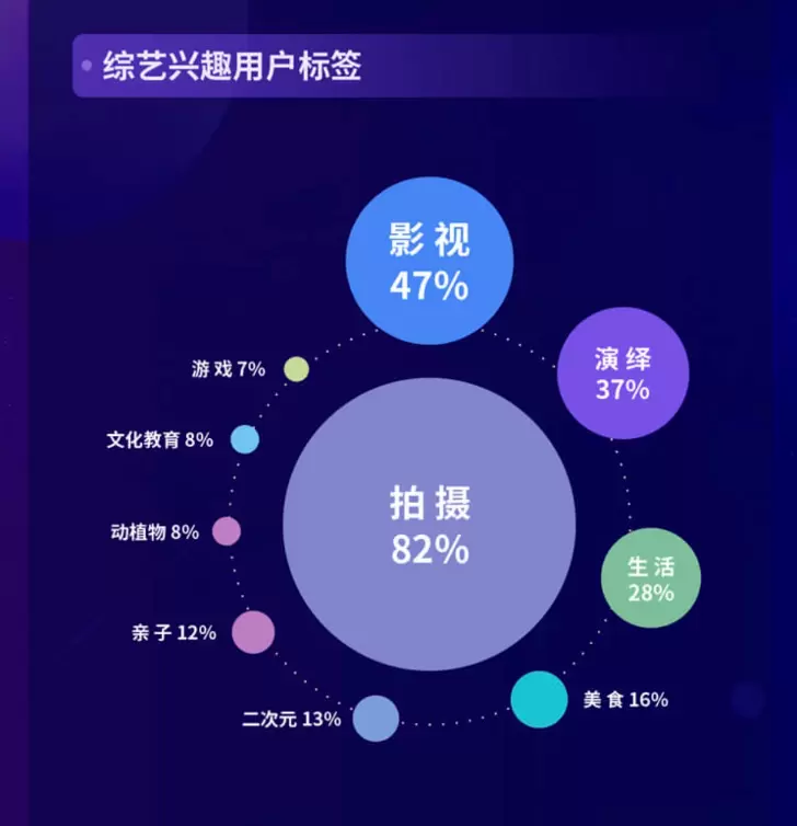 随着综艺作品层出不穷,抖音用户对综艺的关注度也不断提升。白皮书显示,抖音综艺兴趣用户标签中#拍摄#占据第一位,比例高达82%;其次为#影视#高达47%;#演绎#占比37%,#生活#占比28%。