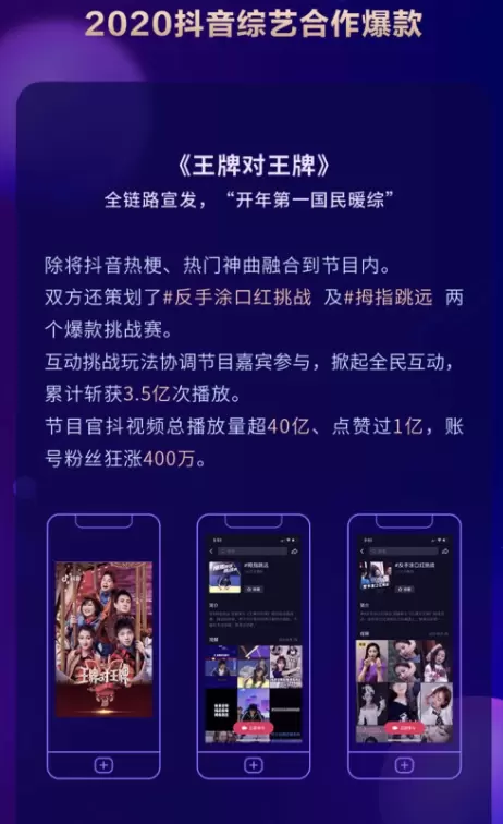 浙江卫视作为由短带长的实践者,使《王牌对王牌》得到全新能量的注入。抖音与浙江卫视携手并进,不仅将抖音热梗、热歌融入到节目中,还策划#反手涂口红挑战 和#拇指跳远 两个爆款话题挑战赛,掀起全民互动。最终节目官抖视频总播放量超40亿,点赞过1亿,节目官方账号涨粉400万,让节目得到极大的流量反哺。