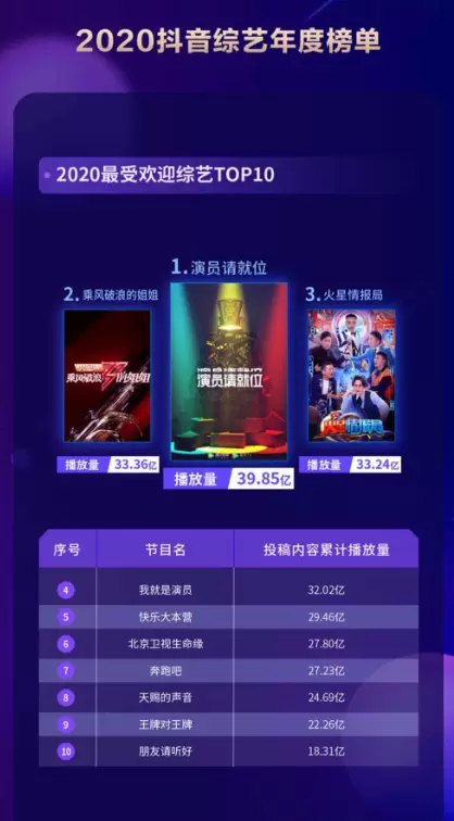 与此同时,从类型上看,竞技类、歌舞类上榜比重大。随着同题材不断加剧的竞争,综N代节目需要从多维度激发内容创新,多链路宣发焕发节目新生。在2020单条播放量最高视频TOP10中,《声临其境》和《王牌对王牌》在抖音上发动全民挑战,增大在社交场上的发声,让节目内容更好地发挥最大价值。