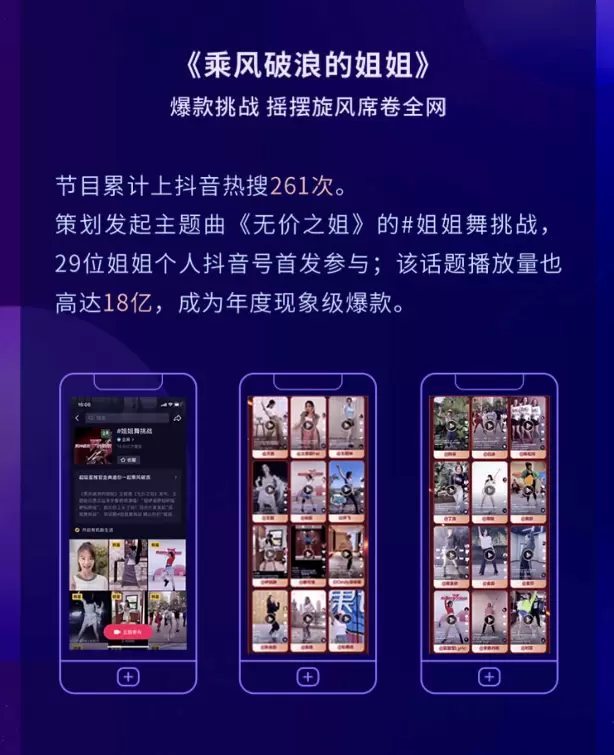 在网络平台上,芒果TV以绝对的创新、优质、高质量的综艺作品在抖音平台持续发力,打造出《乘风破浪的姐姐》等爆款综艺的短视频玩法。策划发起主题曲《无价之姐》的#姐姐舞挑战,结合姐姐们个人抖音号强势带动全民参与挑战,话题播放量高达18亿,而节目累计上抖音热搜261次,主话题播放量不断突破新高,成为2020年当之无愧的现象级综艺。