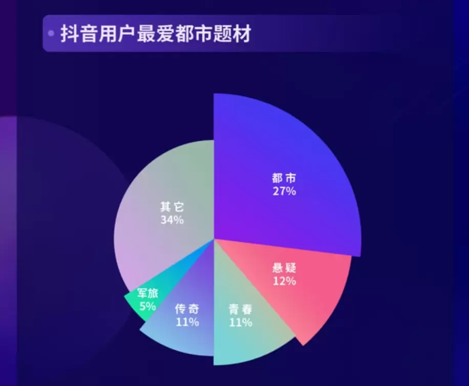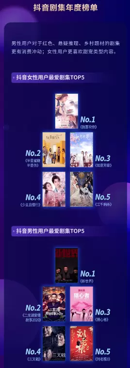 在题材选择方面,都市题材成为抖音用户的最爱。数据显示,都市类、悬疑类、青春类剧集以27%、12%、11%的比例分列抖音用户最受欢迎剧集题材前三名。白皮书显示,男女用户在题材选择方面的偏好也大为不同,根据抖音剧集年度榜单可得知,男性用户偏好红色、悬疑推理、乡村题材,女性用户偏好甜宠题材,《新世界》、《我喜欢你》分别成为2020年男女性用户最爱剧集。