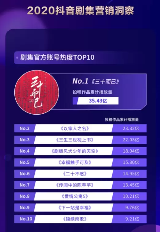 白皮书盘点了2020抖音追剧热点,其中“三十而已开播“、“以家人之名”等都是热榜重心。白皮书还展示了剧集官方账号热度TOP10,《三十而已》位居榜首,相关投稿作品累计播放量高达35.43亿,热度最高。该榜单前10名还有《以家人之名》、《三生三世枕上书》《剧版风犬少年的天空》等,另一部小成本“爆款”《传闻中的陈芊芊》也凭借13.45亿的播放量成为剧集官方账号热度第七名。