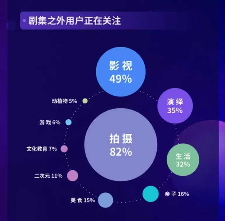 关注剧集内容的用户,在追剧之余,还会关注什么内容呢?白皮书显示,抖音站内剧集内容的用户,最关注的三个领域依次为拍摄、影视、演绎,其中,拍摄类内容占比高达82%。这些内容都与剧集有着极高的关联度。