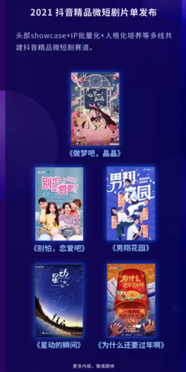在这样的大趋势下,“微短剧”开始兴起。抖音娱乐也将布局“微短剧”领域,通过头部showcase、IP批量化、人格化培养等打造精品化的“抖音微短剧”。白皮书发布了2021抖音精品微短剧片单,其中还有由人气喜剧女演员金靖主演的《做梦吧,晶晶》。