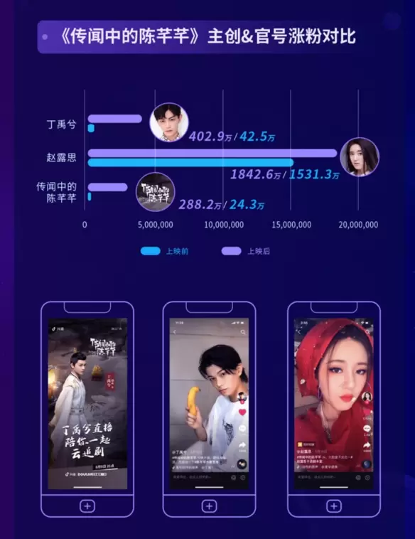 而小众爆款《传闻中的陈芊芊》也在抖音的助推下成功“破圈”。剧播期间,剧方在抖音官方发起#水果变身挑战、#韩烁挑眉杀、#赵露思红衣造型cos 等结合剧情的话题挑战赛,主演赵露思、丁禹兮也配合释放大量独家物料。数据显示,播出期间,赵露思粉丝量从剧播前的1531.3万涨至1842.6万,丁禹兮的粉丝量从42.5万涨至402.9万。