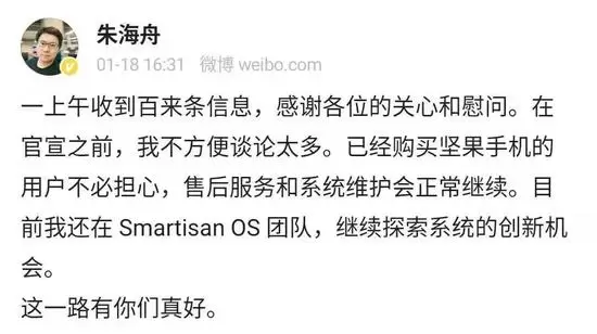 在后罗永浩时代,几乎成为锤友爆料来源和精神领袖的朱海舟,面对新石实验室停止手机业务的舆情时,非常罕见地保持了沉默,只说了一句“有你们真好”。这个姿态像极了当时锤子科技出售手机业务时一言不发的老罗。