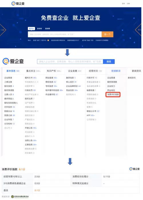 “爱企查”是百度旗下的企业信息查询平台,秉持着“让每个人免费享有获取企业真实客观信息的权利,让大数据服务社会,为建设信用社会发力,积极助力中小企业成长、促进经济社会健康持续发展”的产品文化。现在,用户通过“爱企查”电脑端和手机端官网搜索企业信息时,可通过点击“数据解读”菜单栏下的“消费评价指数”选项查看到深圳企业的指数情况,“爱企查”APP及百度小程序版本也将于1月底同步推出。