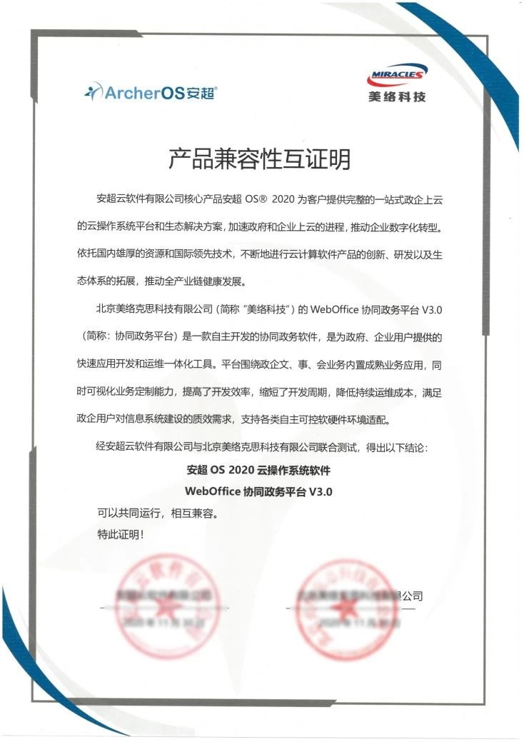 安超OS 2020与WebOffice协同政务平台完成兼容适配后,对于美络科技的用户来说,能够流畅运行在创新技术软硬件环境中,提升自身产品稳定性、安全性、可靠性,加速政企用户上云进程。而对于安超OS 2020的用户来说,能够更好的满足政企用户在安全可靠环境下,快速应用开发和运维需求,提高开发效率,缩短开发周期,降低持续运维成本。