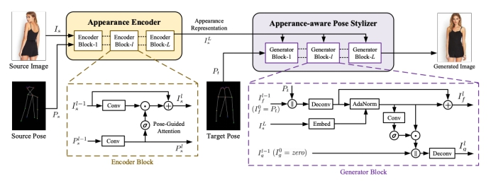在大规模图文内容生成任务中,市场需要机器学习算法和模型扮演一种媒体智能(Media Intelligence) 角色。在许多生成问题上,由于各种原因限制用户需求,需要将给定的人像变换一种形体姿态作为展示,并且保持人物形象、外貌特征、和穿着不变。百度研究了在给定人物肖像图片、原始姿态标签、以及目标姿态标签的情况下,根据目标姿态标签,生成人像的深度学习模型。该模型拥有两个部分 (a)Appearance Encoder: 能够将人物肖像根据其姿态标签进行面向体貌、穿着的特征编码,以及 (b)Appearance-aware Pose Stylizer (APS): 能够将体貌、穿着特征重新根据目标姿态标签解码成为人像图片。该算法模型的核心难点是如何在训练中将体貌、穿着特征与人像的姿态分离 (disentangle)。本文提出的算法与模型在多个数据集上取得了优秀的成果。其姿态编辑出来的图片几乎人眼不可辨别真伪,并能够保有原始中人像的大量风格要素。