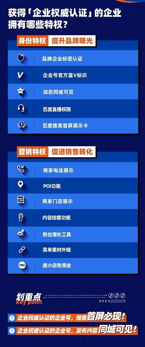 除了身份特权之外,「企业权威认证」还附带更丰富强大的营销功能,「商家电话展示」、「POI功能」、「商家门店展示」、「内容挂载功能」、「粉丝增长工具」、「菜单素材外链」、「度小店免佣金」7项营销特权的存在,不仅可以强化品牌曝光,也彻底打通了内容展示和销售转化之前的屏障,通过精准运营工具的加持,可以进一步提升粉丝的销售转化率。