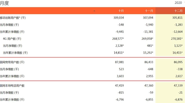 1月21日消息,中国联通近日公布其2020年12月份运营数据,当月中国联通净减移动出账用户128.3万户,累计达3.05811亿户。其中,4G用户当月净增112.3万户,累计达2.70181亿户。