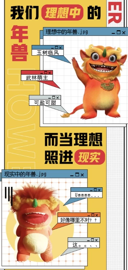 在故事中,美好的一面总能流传的更远。那不如将传说颠覆一下,让“不好”变成美好。比如把凶狠的“年兽”变成萌宠,TA也能广受欢迎吗?