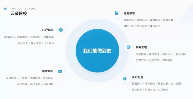 在线网校系统功能十分丰富,通过云朵网校可以轻松实现在线直播教学、课程录播授课、智能排课等等,根据不同的课程表现方式研发独特的课程体系给用户提供丰富的选择,能够满足用户在不同情况的需求。