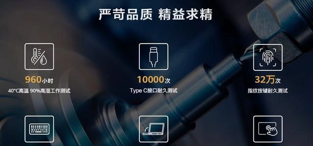 在品质上,华为MateBook家族遵从高于行业标准的"更严苛的品质标准"。1万次的Type-C接口耐久测试、500万次键盘耐久测试、2.5万次笔记本铰链开合耐久测试、32万次指纹按键耐久测试以及100万次触控板点击耐久测试的严苛历练,最终带给用户可靠的品质体验。