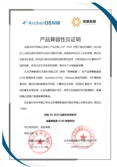 日前,国产通用型云操作系统安超OS 2020与海量数据库G100管理系统完成产品兼容性互认证。本次兼容性互认证经华云数据与海量数据联合测试得出:产品相互兼容,系统功能运行稳定,产品体验良好。