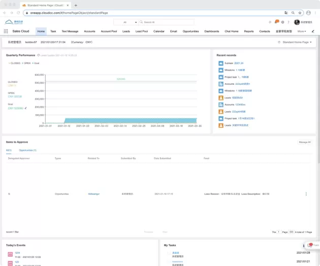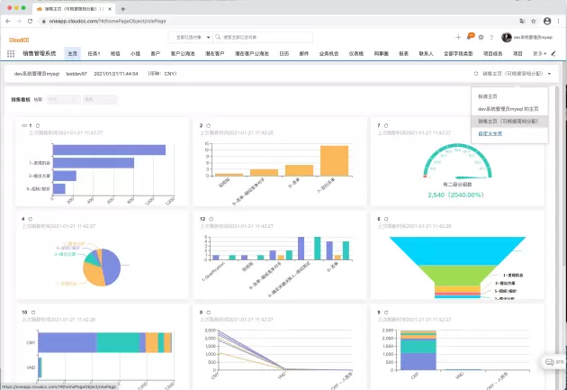 CloudCC 10支持标准主页、个人主页、简档主页3款主页灵活切换。自定义的个人主页和简档主页,支持添加整张仪表板、仪表板内单个图表、卡片视图和标准组件;可针对不同部门的实际需求,通过自定义化设置主页内不同的数据模块,让每个部门,如销售、人事聚焦于各自的关键数据。