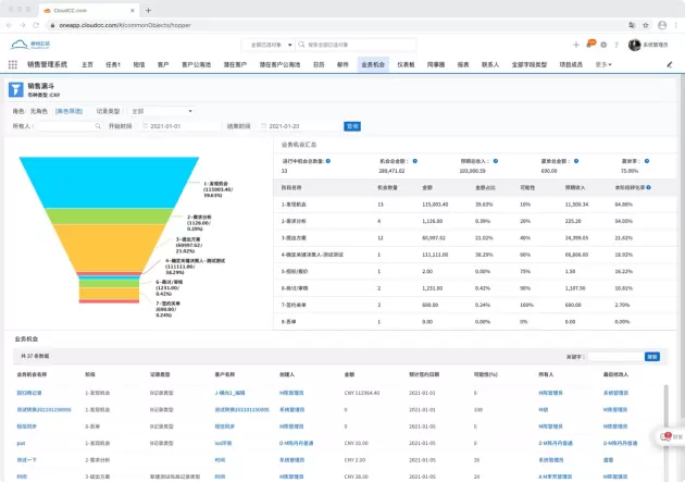 神州云动CloudCC 10可定制化的智能仪表盘功能实现了重构数据价值,通过饼状、扇形、柱形等图形化数据,多图表联动,形成如部门-人员-业务机会之间的直接联动,