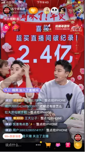 1月20日,腊八节当天,苏宁易购超级买手直播间,贾乃亮直接破了自己早前的2.4亿直播记录。七小时1.5亿,九小时破2亿,2.4亿是截至目前超买最好的抖音记录。全场庆贺,贾乃亮竟然愣住,直呼“什么,我破记录了?!”。