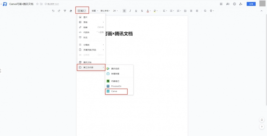 打开腾讯文档插入Canva可画作品链接—— 在腾讯文档电脑端打开指定的在线文档,在页面左上方点击“插入”,在下拉菜单中选择“第三方内容”,点击Canva,插入已复制的链接即可。