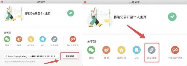 获取印象笔记内容链接—— 打开印象笔记客户端,选择右上角“公开分享”按钮,在操作面板中点击“分享链接”,成功复制链接到剪贴板中。